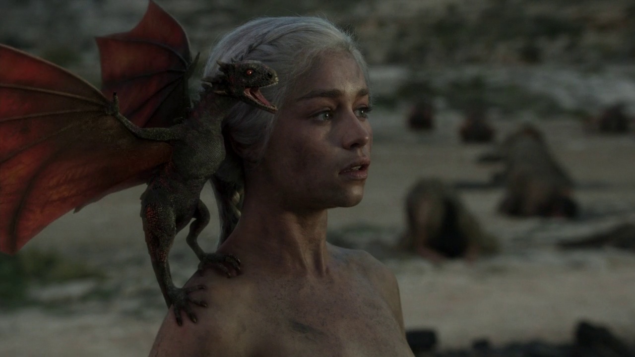 And the very end was interesting, because early in the season, I can’t remember which episode, she places a dragon egg in the fire and picks it up, but it doesn’t hurt her hand. I remember saying to my husband, “Maybe the eggs are like popcorn and they’ll pop open and the dragons will jump out.” Of course, when Daenerys herself was walking toward the pyre that image was the LAST thing on my mind, and all I could think of is when Daenerys was told in last week’s episode that once Drogo was dead, she was nothing, but man, if that woman survives the pyre burning, they’ll be loathe to walk away from her! So when Ser Jorah walked up to her and she lifted her head, I thought that was the miracle. Until something popped up behind her and I thought, “Oh my GOD she spilled water on Gizmo and there’s a Gremlin behi— no, wait… OMG it’s a dragon.”